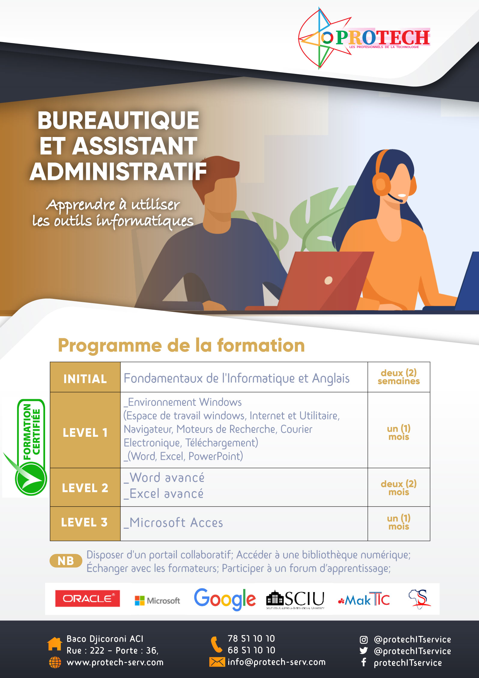 La formation Bureautique et Assistant Administratif permet à ceux qui la preparent d'apprendre a se servir des différents logiciels de bureautique sur un ordinateur. Prenez en main tous les aspects de Windows et apprenez à envoyer des courriers, à saisir un rapport, à créer des tableaux chiffrés et à mettre en place des présentations dynamiques.