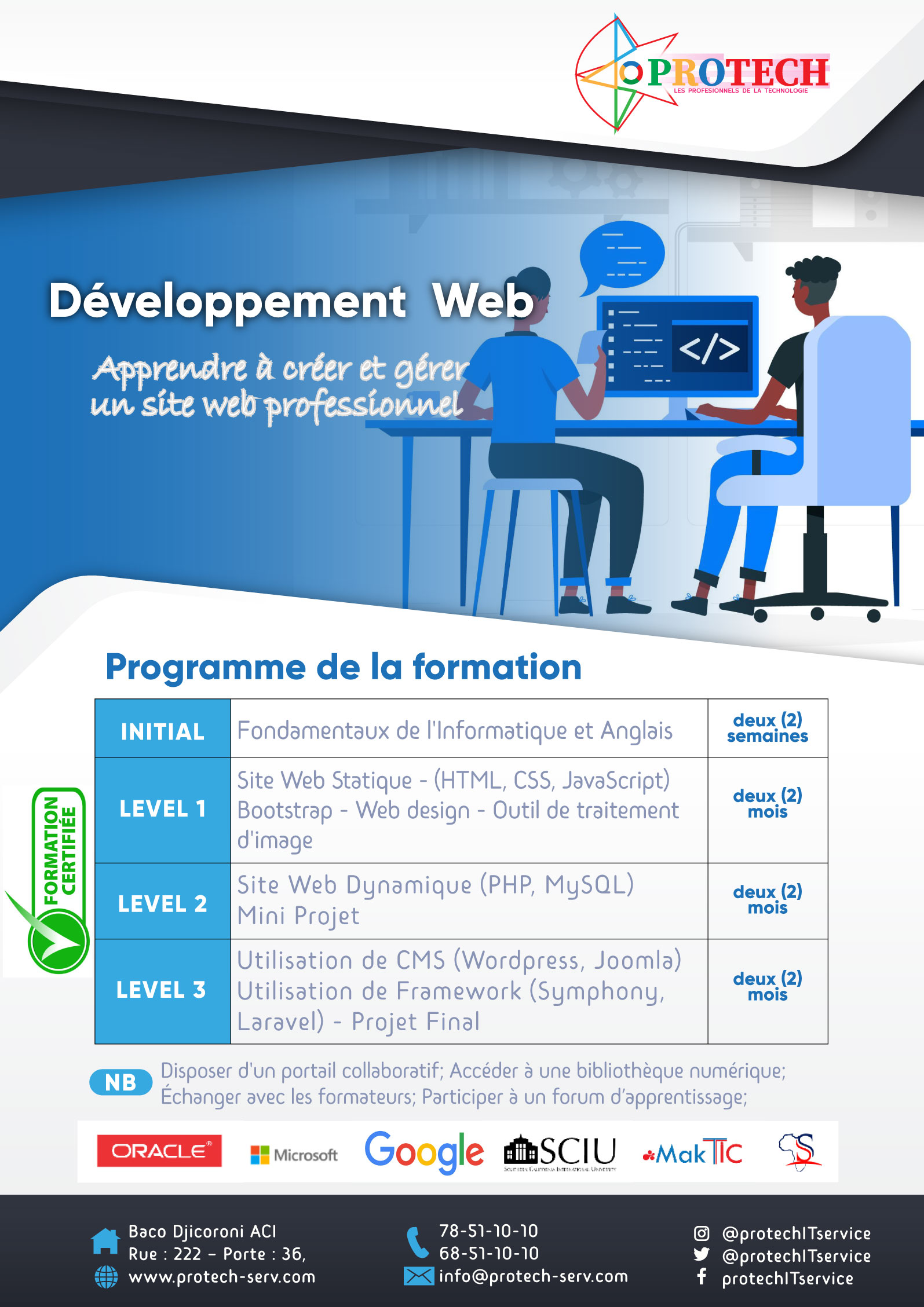 La formation Développement Web permet à ceux qui la préparent d'apprendre à concevoir des sites et des interfaces web intégrant du contenu éditorial et multimédia. Le métier de développeur web est très recherché ! En tant que Développeur web, vous serez un expert en langages de programmation (HTML-CSS, JavaScript, PHP…) et en CMS (Wordpress). Vous serez capable de créer des sites web dynamiques ou statiques, responsives et respectueux des normes en termes d’accessibilité et d’ergonomie.